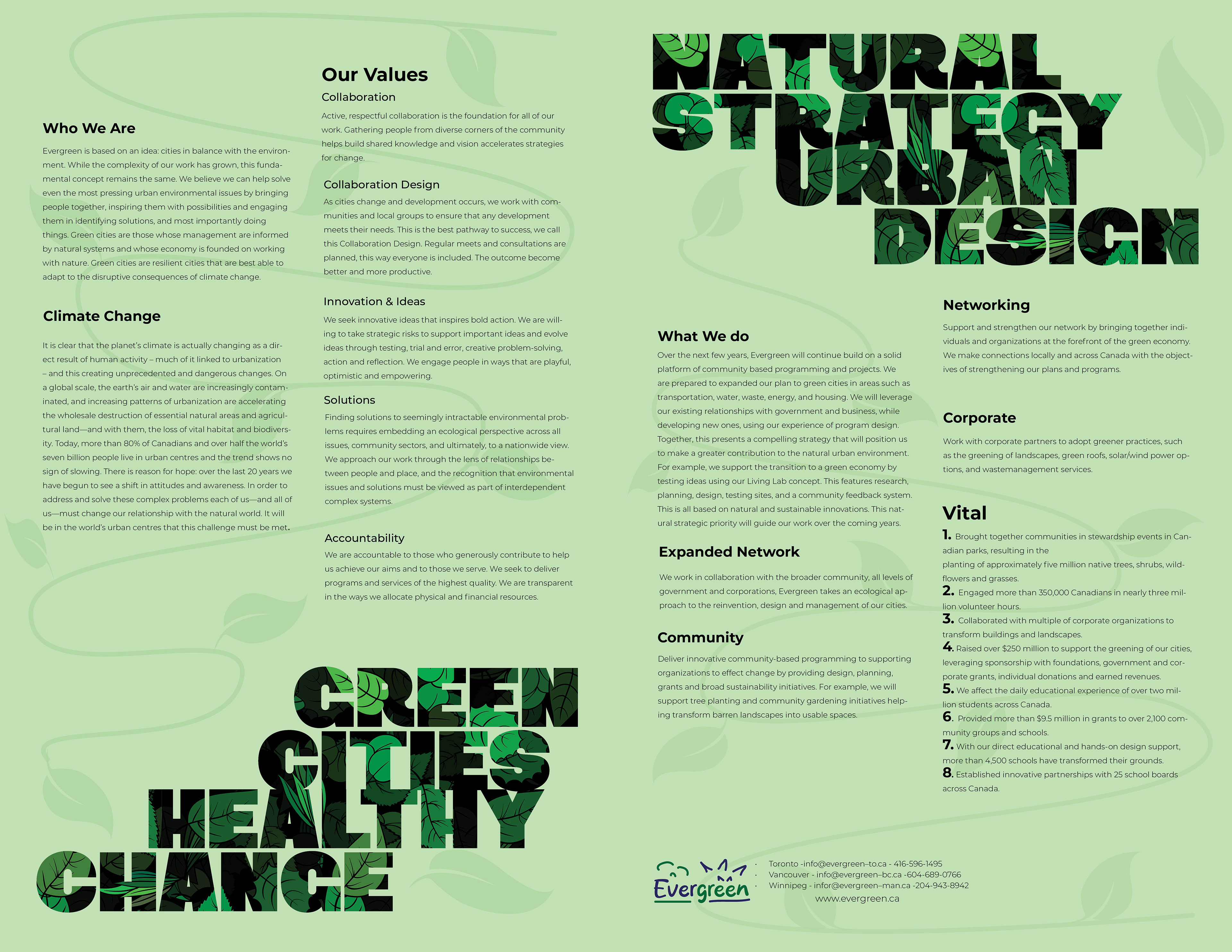 This Project was done (conceptually) for Evergreen. Evergreen is a company focused on creating sustainability in Urban environments .The Goal was to show a different way the company could present themselves. I created a spread containing information about the company and redesign their logo.